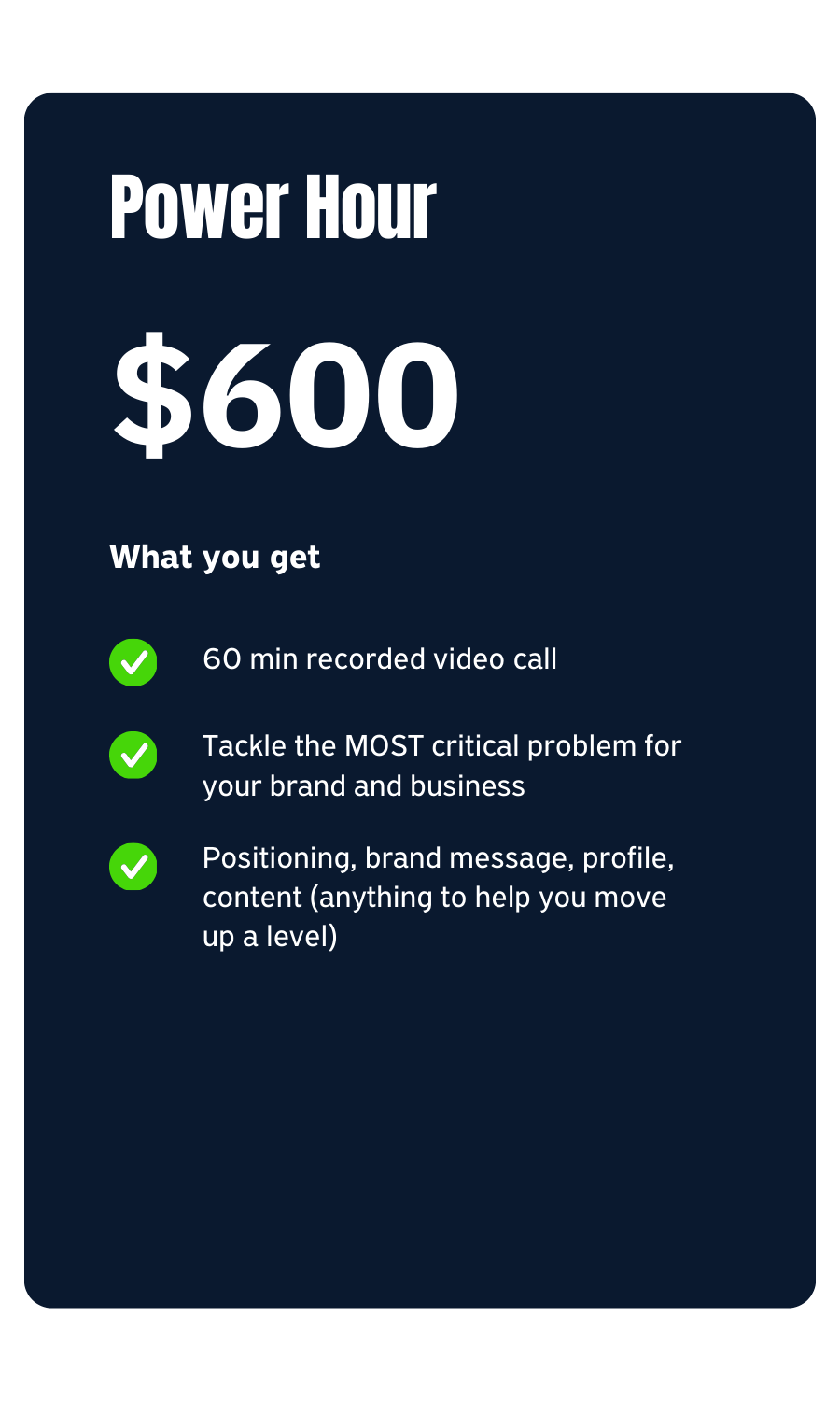 We’ll zero in on your most urgent brand and business challenge — and solve it. Whether it’s your positioning (most start here), messaging, brand architecture, offer, or LinkedIn execution, you’ll walk away clear, confident, and ready to act.$600/hour